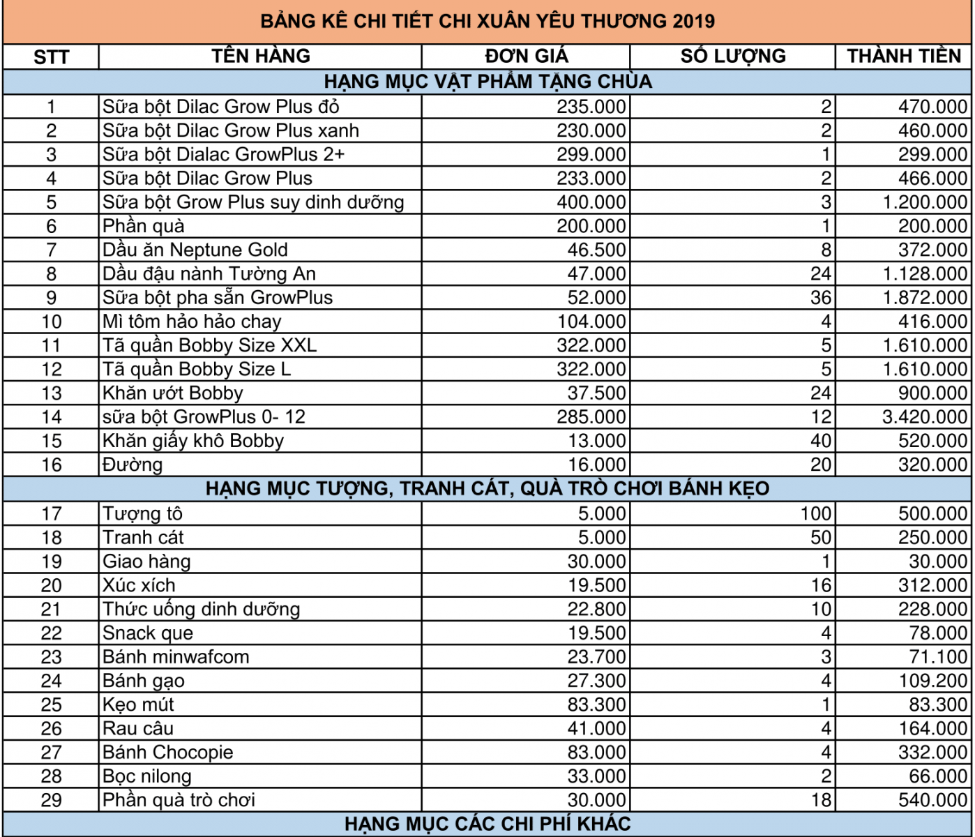 Mời xem chi tiết đóng góp và thu chi của Xuân Yêu Thương 2019 tại đây: